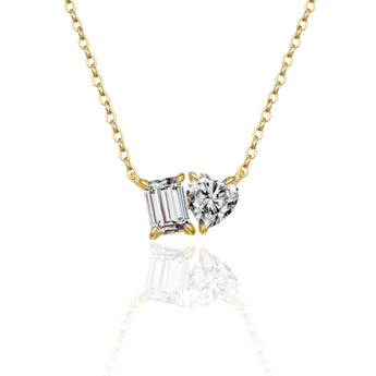 The Inaya Necklace features a refined duo of stones, combining a sleek emerald-cut with a timeless heart-cut design. The subtle contrast creates an elegant sparkle that catches the light beautifully, making this necklace a sophisticated yet modern statement.